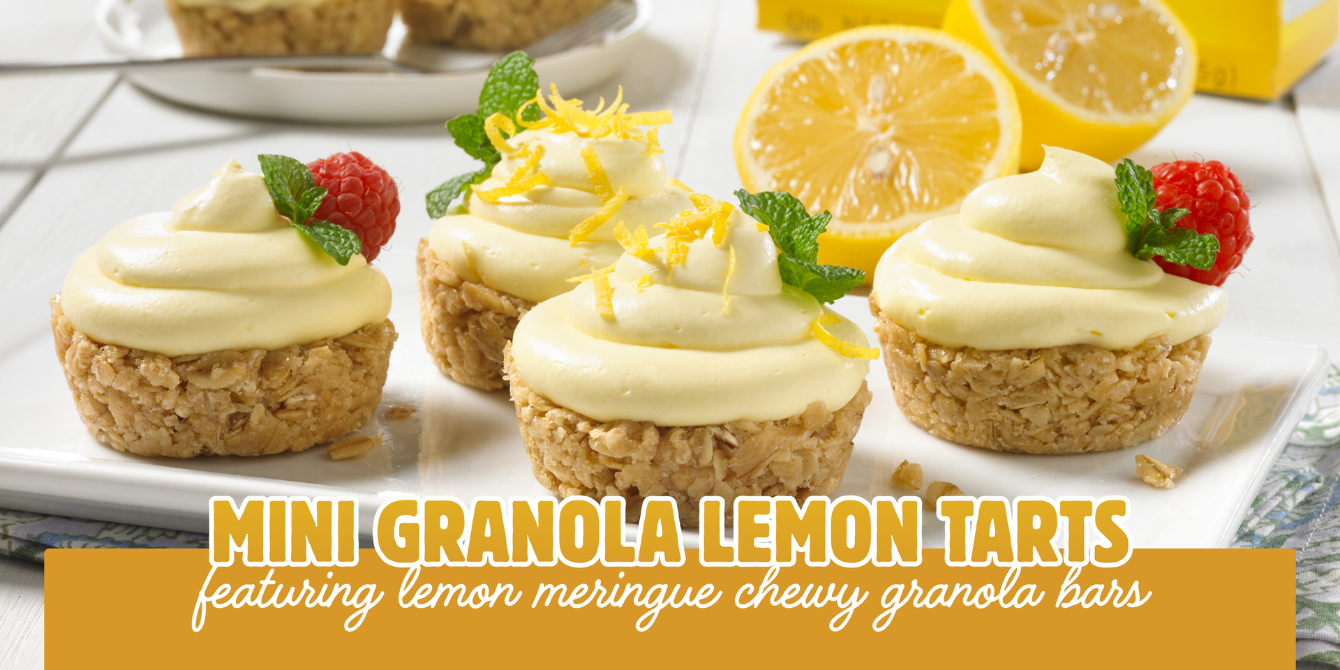 Enjoy a zesty twist with our Mini Granola Lemon Tarts! Our seasonal Lemon Meringue Chewy Granola Bars are recreated as tarts with a delicious, lemony cream cheese mixture! Topped off with fresh raspberries, everyone will enjoy the refreshing taste at a cookout, summer birthday party or a summer brunch with friends and family.