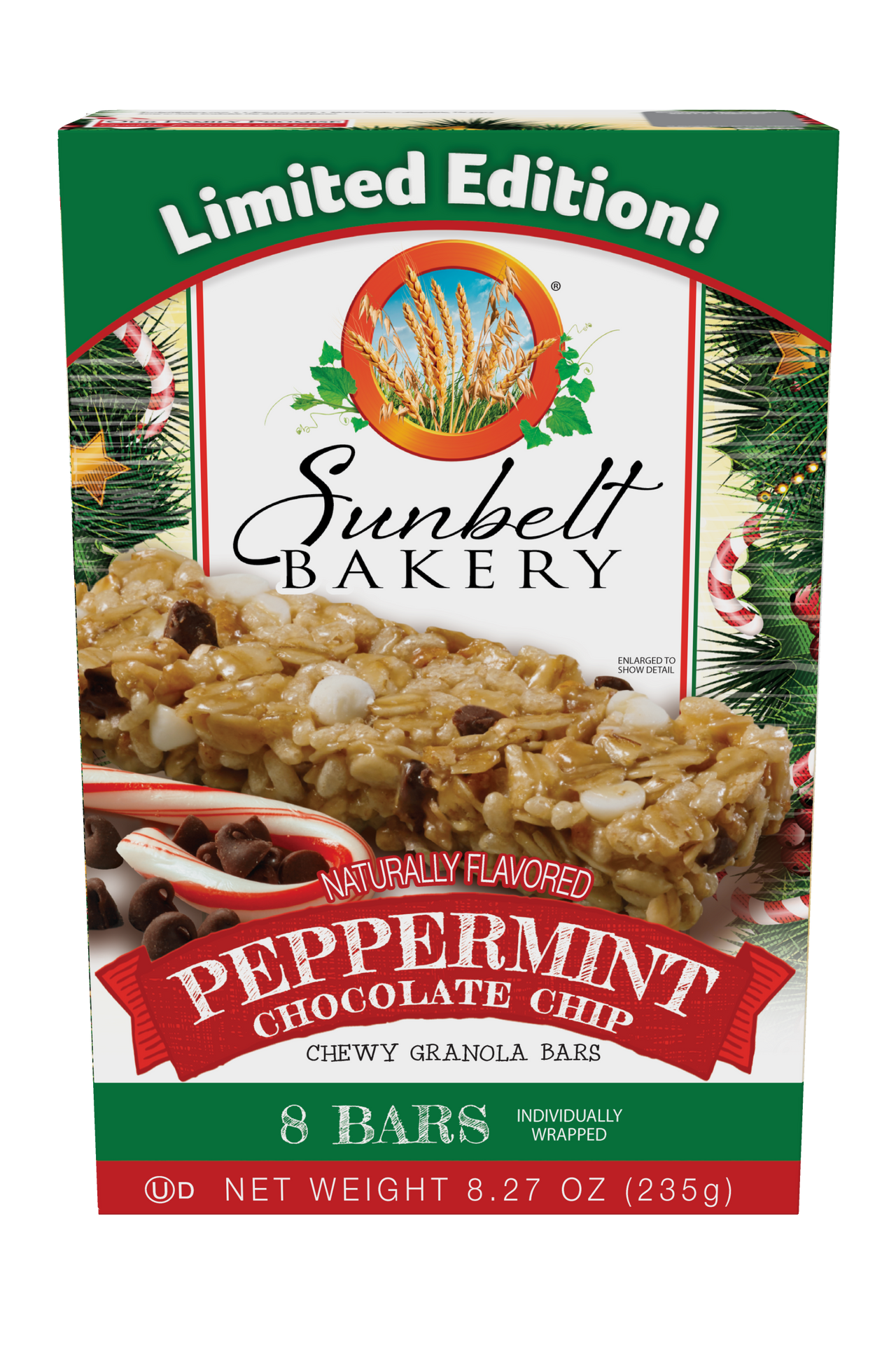 Enjoy the classic taste of the holidays with Sunbelt Bakery Peppermint Chocolate Chip Chewy Granola Bars. Enjoy chocolate chips and peppermint-flavored chips mixed with our tasty granola blend. These delicious bars also have 7 grams of whole grains. Great for bringing along while shopping for last minute gifts. Like the holiday rush, these cheery-treats are here for a limited time only. Find them at your favorite grocery store! You can also purchase an 8-count Family Pack online by clicking the "buy now" button!