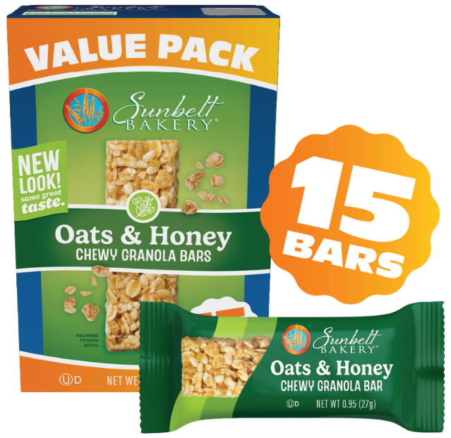 On-demand energy is a bite away with Sunbelt Bakery Oats & Honey Chewy Granola Bars. Deliciously satisfying, this fan-favorite granola bar is a classic snack for good reason! Honey is expertly mixed with oats to create a delectable snack that is great for any time of day. Made with 8 grams of whole grain per serving, enjoy this classic granola bar next time you are feeling a mid-day slump at work!